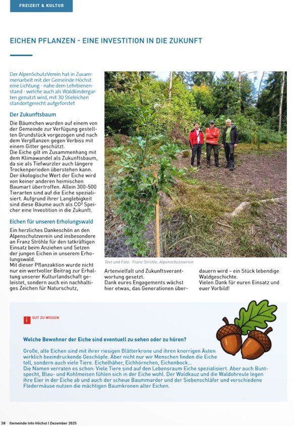 In der Gemeinde-Info Höchst vom Dezember 2025 wurde unsere Aktion mit einem schönen Artikel gewürdigt. Franz Ströhle erhielt von der Gemeinde Höchst einen Anteil bei den Schrebergärten, auf dem er aus verschiedenen Baumsamen kleine Bäume zog. Die ersten 30 Eichen konnten wir nun zusammen mit Mathias von der Gemeinde im Erholungswald, nahe dem Waldkindergarten, anpflanzen. Wie im Bild ersichtlich, haben sie im Pflanzgarten bereits eine beträchtliche Höhe erreicht.